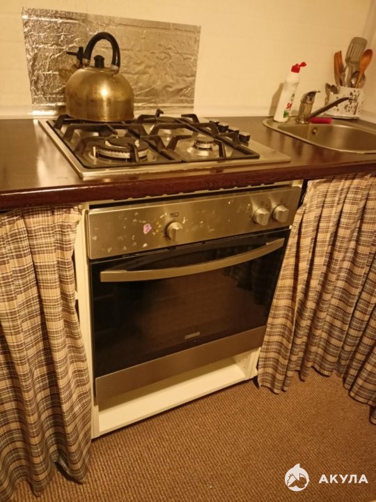Полностью оборудованная кухня: холодильник, плита с 4 конфорками, духовка, микроволновка, электрический чайник, небольшой набор посуды.