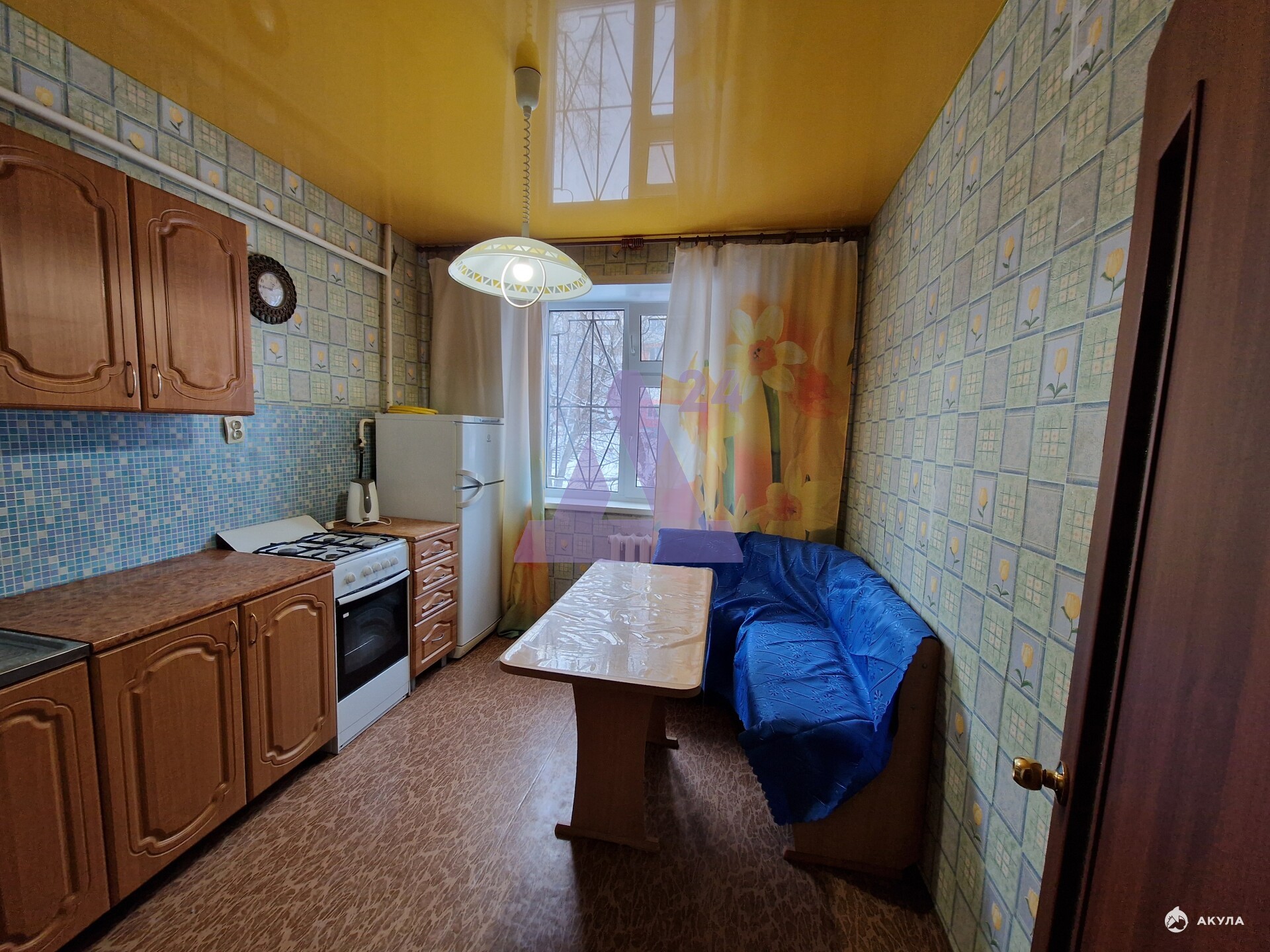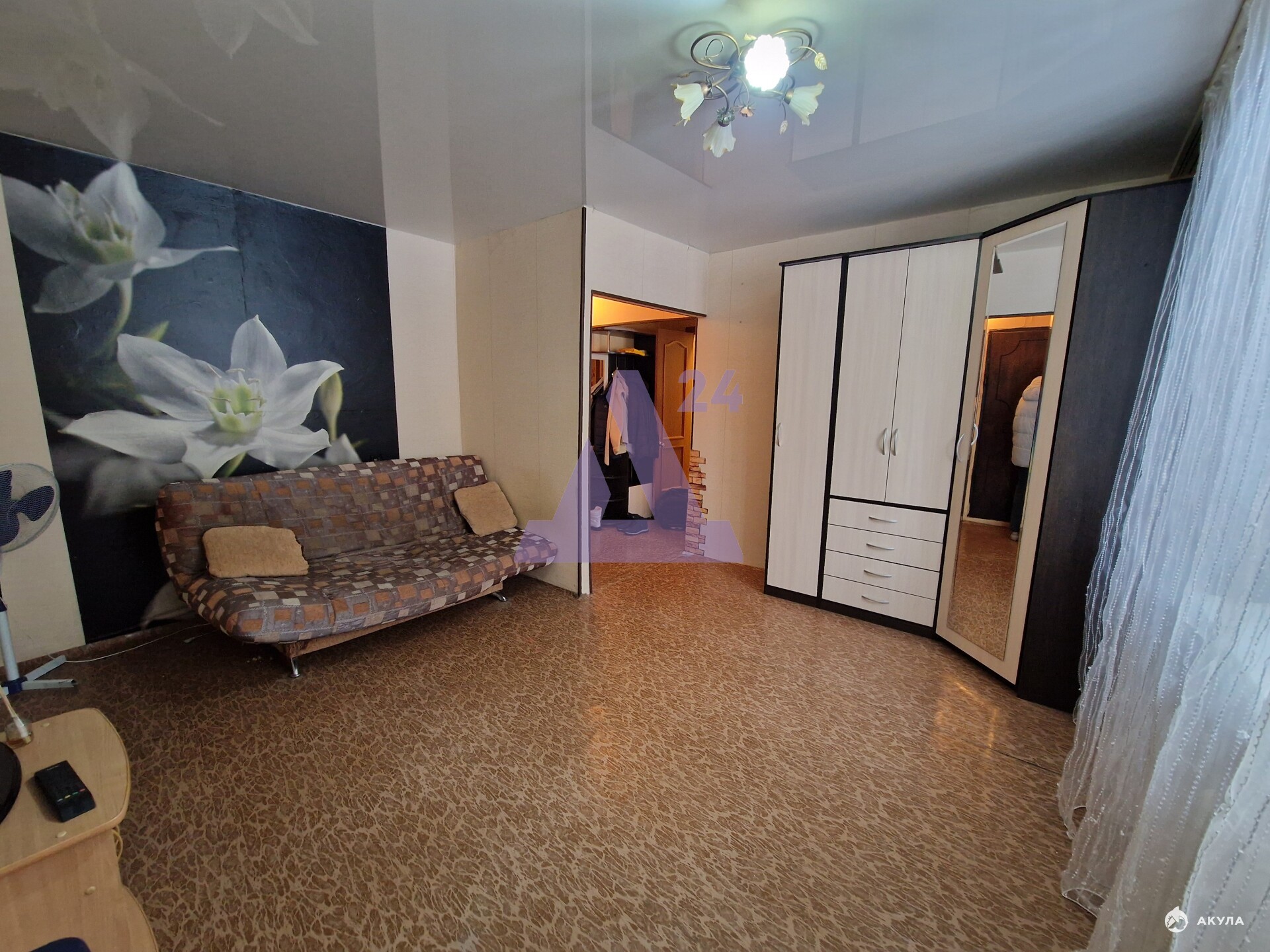 В квартире выполнен косметический ремонт. Натяжные потолки обеспечивают аккуратный внешний вид. Напольное покрытие — линолеум, практичный в эксплуатации и уходе.