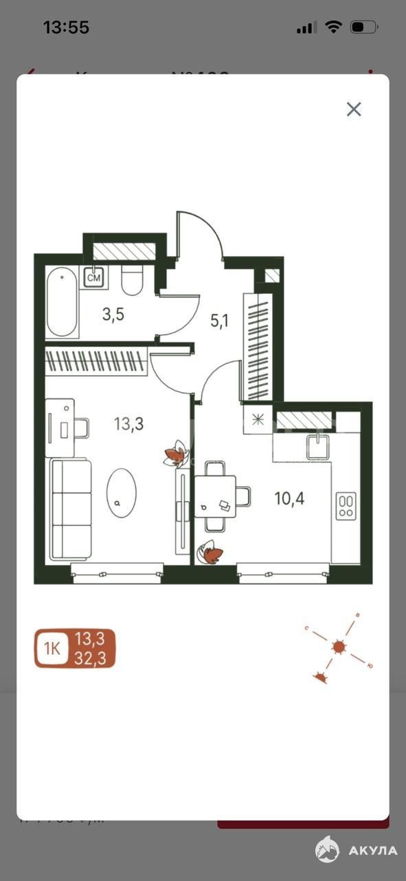 Площадь квартиры 32, 3 кв м., кухня 10, 4 кв.м., гостинная 13, 3 кв.м.