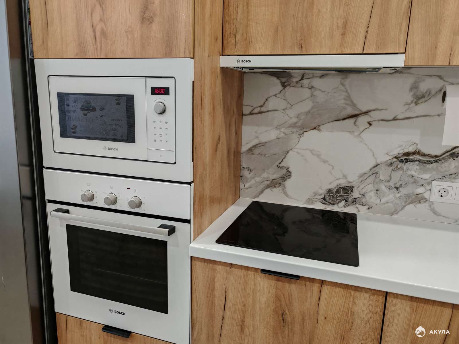 Современный кухонный гарнитур в отличном состоянии. Остается вся встроенная техника BOSH посудомойка, варочная поверхность, духовой шкаф, микроволновка, вытяжка.