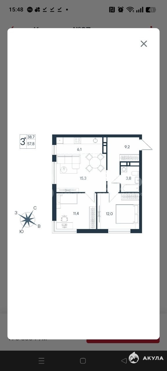 Площадь квартиры 57, 8 кв м., кухня 6, 1 кв.м., гостинная 15, 3 кв.м, спальня 11, 4, спальня 12 кв м
