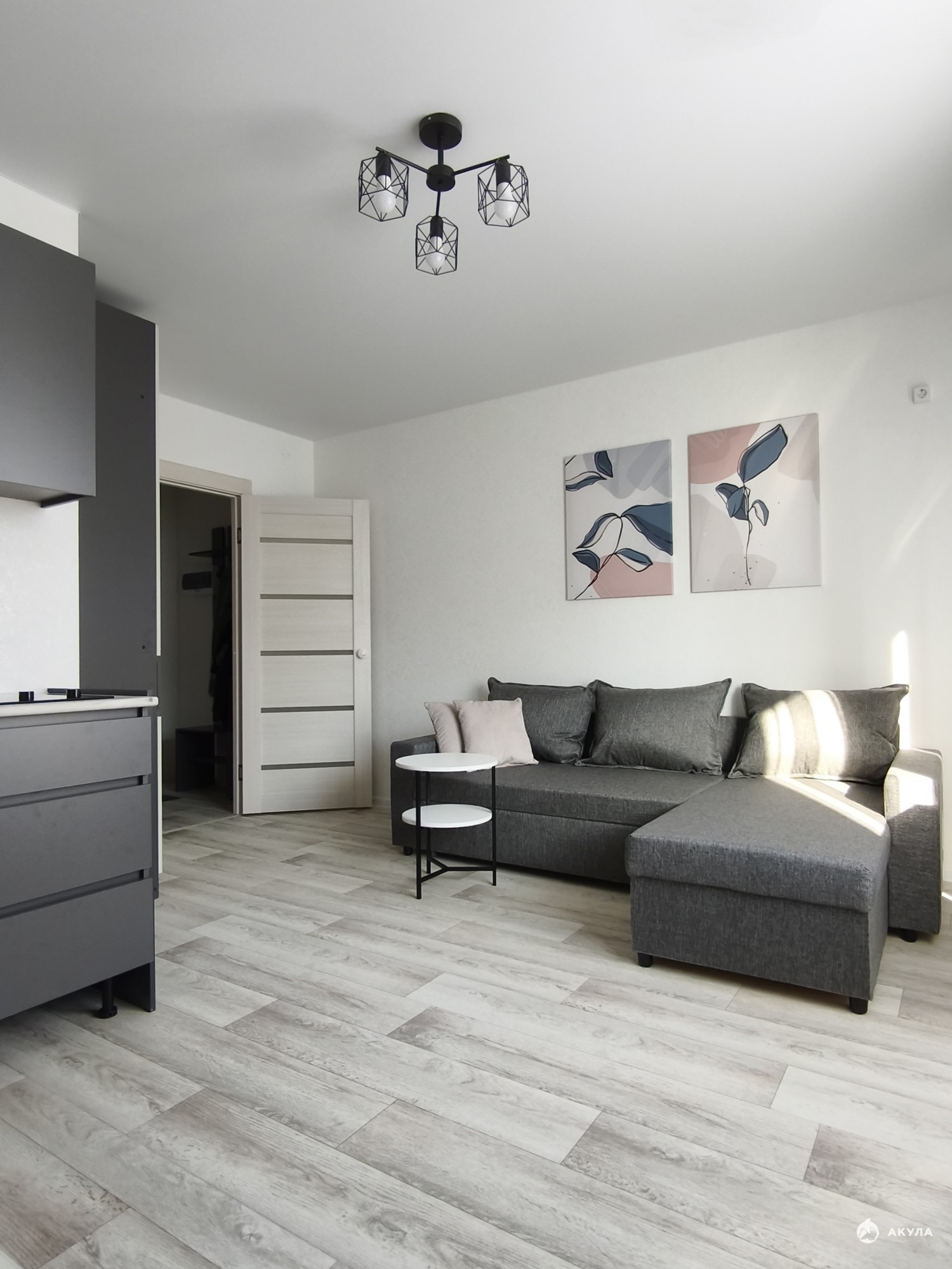 Квартира укомплектована кухонным гарнитуром с электрической плитой, холодильником, обеденным столом и стульями, большим раскладывающимся угловым диваном; шкафом для одежды и стиральной машинкой.